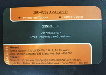 Insane Tattoos is a well-recognized Tattoo Shop in Thane, providing services to the clients in and outside Thane. They are one of the most famous Tattoo shops in Thane, providing various services like tattooing, piercing, etc. They are known for thei