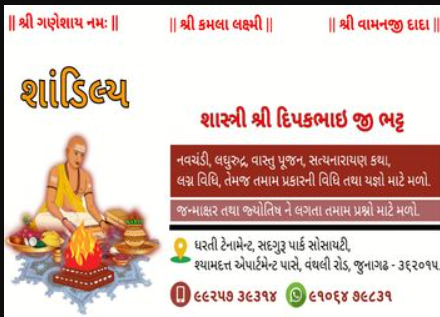 SHASTRI SHRI DEEPAKBHAI G. BHATT Shastri Shri Deepakbhai G. Bhatt is one of the renowned astrologers in Junagadh. His field of expertise includes various types of astrological problems like Vastu shastra, love & relationship problems